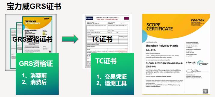 宝力威tpu荣获全球回收标准(GRS)认证,使我司生产履历更加透明化,增强了产品绿色环保竞争力。